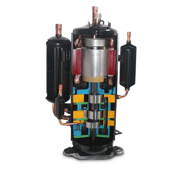 三缸雙級變容積比壓縮機可實現兩 種不同容積比的雙級壓縮,可降低單個氣缸的壓縮比,減小了 泄漏量,提高了壓縮機的容積效率,與單級壓縮系統(tǒng)相比,雙 級增焓壓縮系統(tǒng)具有能力高、能效高和可靠性高的優(yōu)勢,使用 在家用熱泵空調、多聯(lián)式熱泵空調、戶用冷水熱泵機組等多種 類型的熱泵產品中。