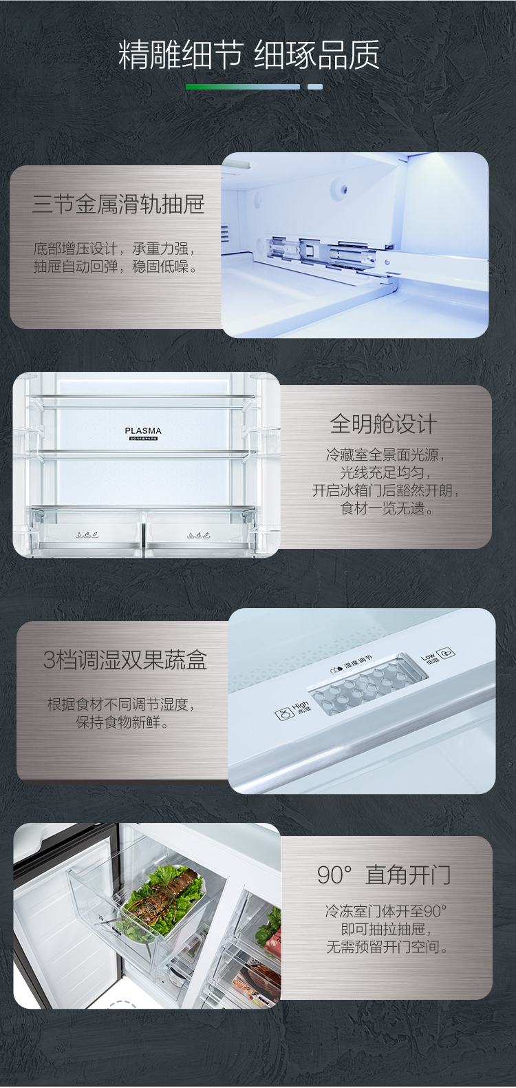 搭載-5℃嫩凍凝鮮科技,鮮嫩兩星期,輕松一刀切。Plasma等離子除菌凈味,除菌保鮮,長久新鮮。4檔保鮮模式,多重角色時(shí)刻新鮮。