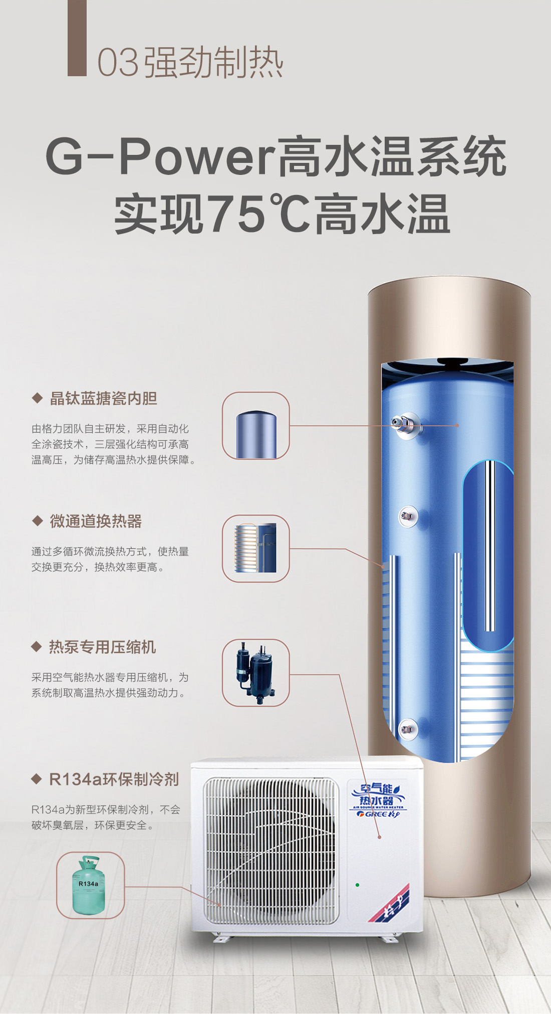高溫大水量,沐浴暢快享,搭載G-power高水溫系統(tǒng),成就水溫更高,水量更大的空氣能熱水器,更達(dá)1級(jí)能效,省電高達(dá)75%,全家人暢快享受的沐浴選擇。