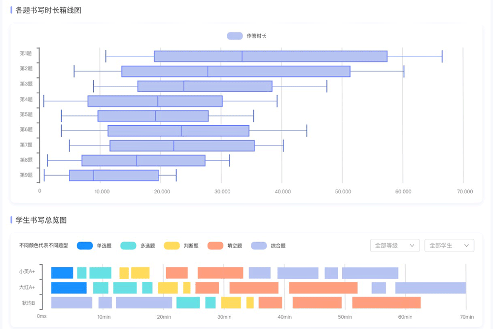 教研閱卷所記錄的高頻錯因特征,以及得分率、答題時長、成績分布、知識點掌握情況自動匯總統(tǒng)計,一圖呈現(xiàn)。從多個維度指標,為教學(xué)決策提供精準分析和指導(dǎo)。從考試結(jié)果這個單一評判標準,轉(zhuǎn)變?yōu)閷荚囘^程的多維度評判,進而更加精準地檢驗學(xué)生的知識掌握。
