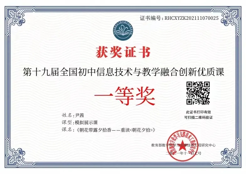 龍城中學(xué)教育集團(tuán)六名教師在本次比賽中喜獲佳績,其中語文學(xué)科尹茜老師展示的《朝花帶露夕拾香——重讀<朝花夕拾>》現(xiàn)場(chǎng)模擬課,榮獲第十九屆全國初中信息技術(shù)與教學(xué)融合創(chuàng)新優(yōu)質(zhì)課一等獎(jiǎng)。