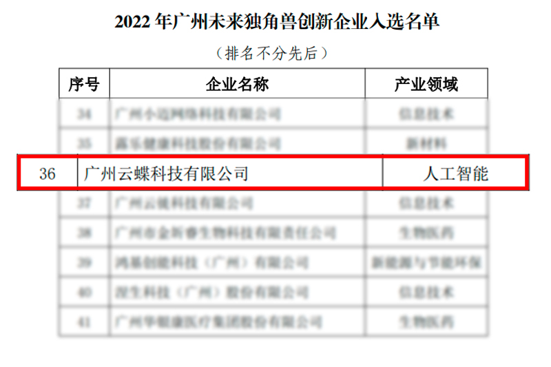 近日,由廣州市科學(xué)技術(shù)局指導(dǎo),廣州市科技創(chuàng)新企業(yè)協(xié)會等聯(lián)合主辦的“2022年廣州獨角獸創(chuàng)新企業(yè)榜單”遴選結(jié)果出爐,云蝶科技連續(xù)三年榮獲廣州未來獨角獸創(chuàng)新企業(yè)。