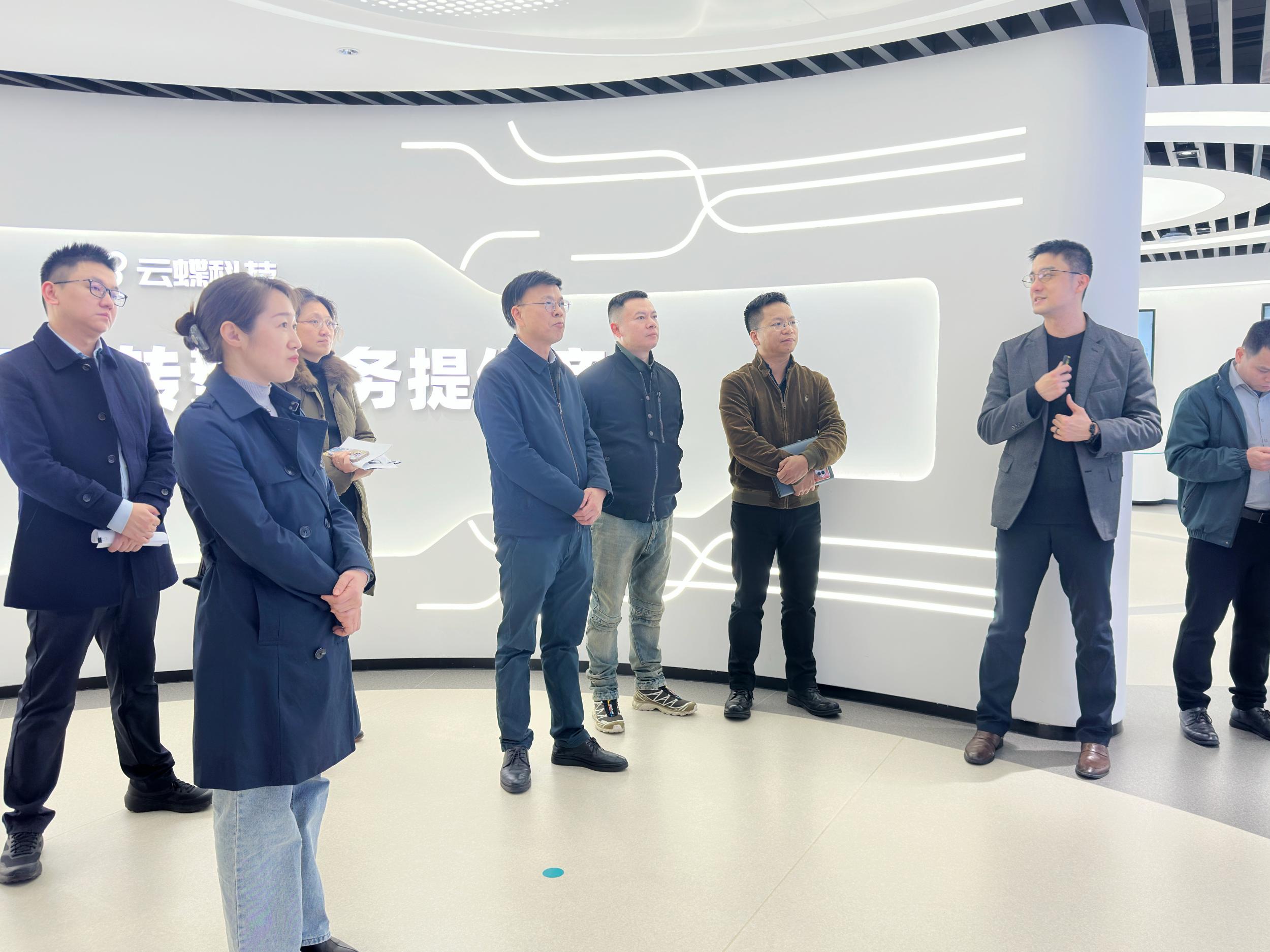 在云蝶負(fù)責(zé)人的陪同下,鄧慶堅一行參觀了企業(yè)展廳,全面了解云蝶科技的發(fā)展歷程及未來規(guī)劃。展廳內(nèi)展示的各類人工智能相關(guān)產(chǎn)品和方案,見證了云蝶科技如何將先進的技術(shù)理念轉(zhuǎn)化為實際生產(chǎn)力,推動人工智能產(chǎn)品走向市場,賦能千行百業(yè)。
