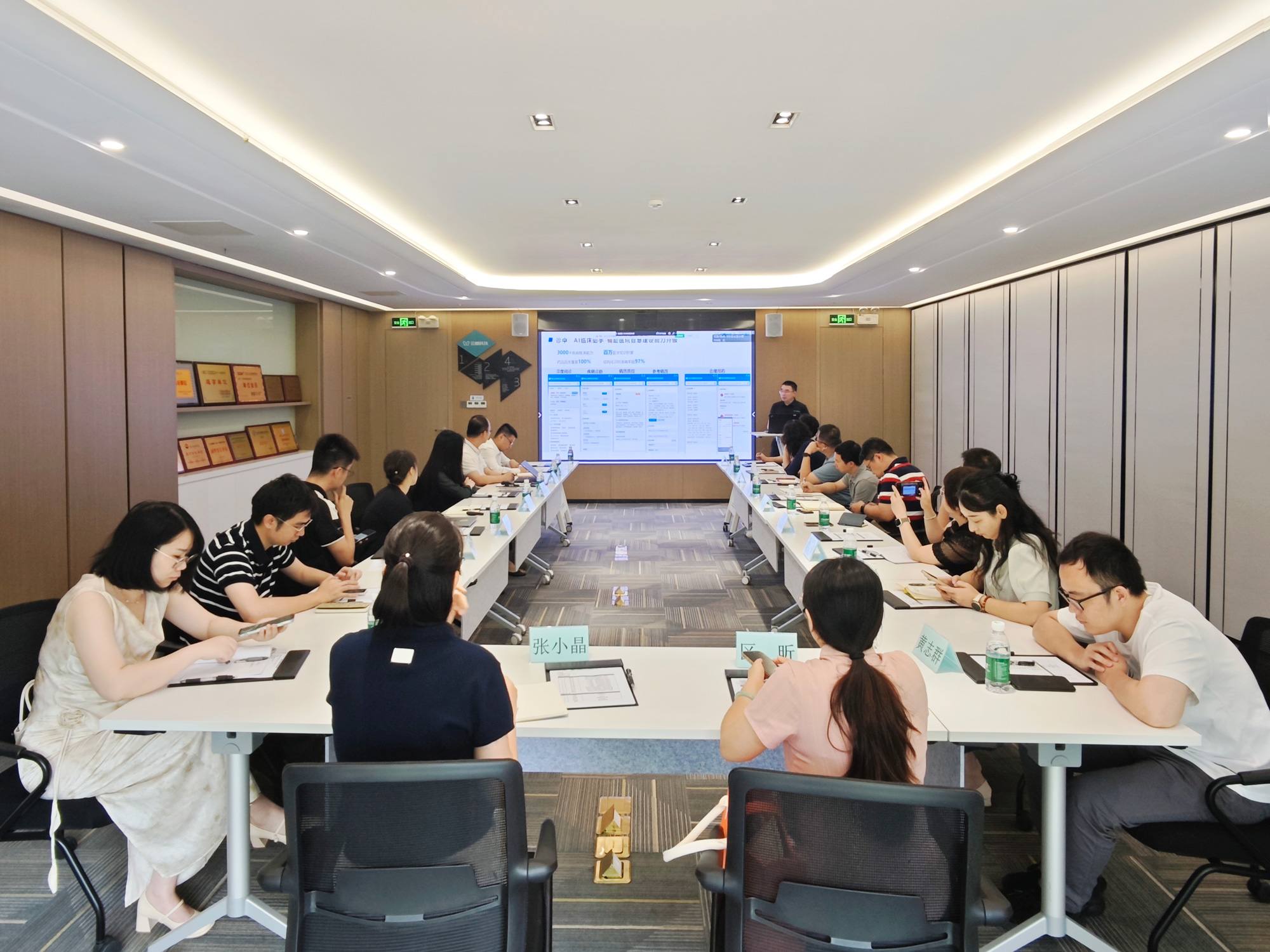 在公司展廳,云蝶科技副總裁羅崇鍵向海珠區(qū)衛(wèi)生健康局一行介紹了公司在人工智能與大模型領(lǐng)域的發(fā)展歷程、技術(shù)優(yōu)勢(shì)以及為教育、醫(yī)療、政務(wù)等多個(gè)領(lǐng)域量身打造的智能化解決方案。來(lái)賓們?cè)诼?tīng)取介紹與體驗(yàn)產(chǎn)品后,對(duì)云蝶科技以人工智能賦能產(chǎn)業(yè)創(chuàng)新給予高度評(píng)價(jià)。