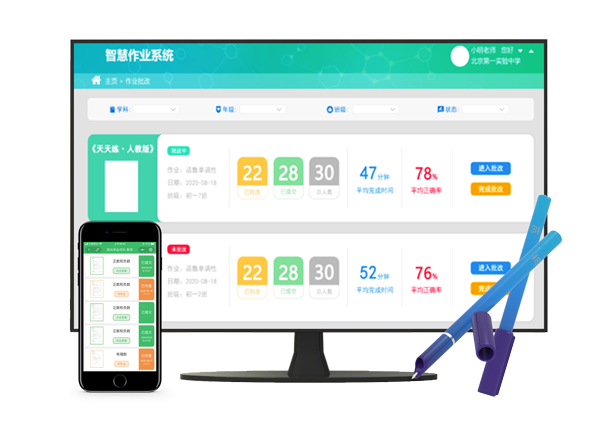 學(xué)生無需身處教室,可在任何地方用點(diǎn)陣筆書寫作業(yè)并在線提交,隨后老師即可在平臺(tái)上看到作業(yè)完成情況,并由系統(tǒng)自動(dòng)批改客觀題,老師在線批改主觀題,批改后即刻生成成績(jī)報(bào)告,實(shí)現(xiàn)高效的教與學(xué)。